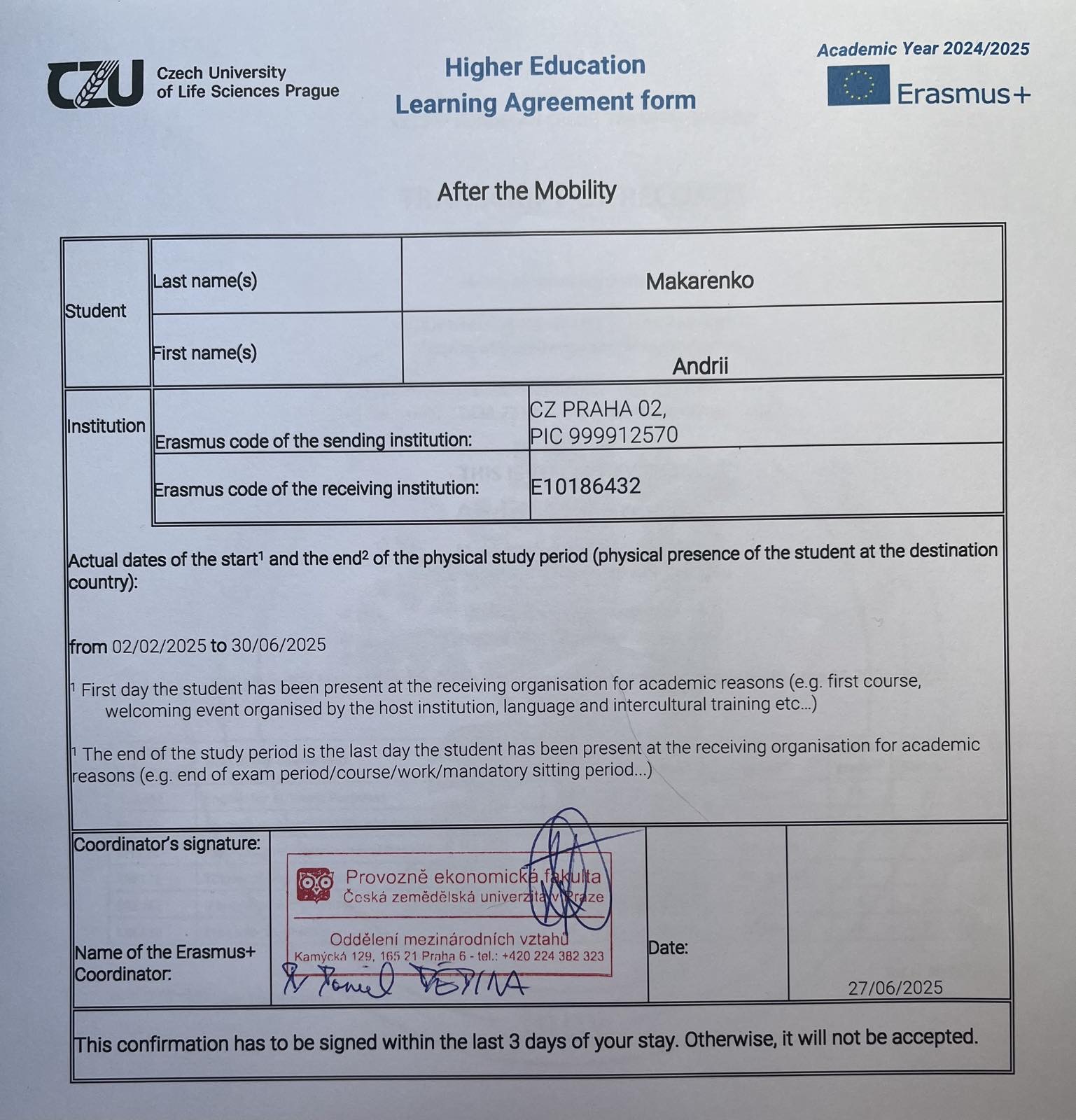 Участь в академічній мобільності — це не лише можливість отримати нові знання, а й важливий крок до розвитку особистості та кар’єри у глобальному контексті. Згідно програми академічного обміну Erasmus+ KA107, що реалізується в Сумському НАУ, здобувач 2 курсу за скороченим терміном навчання спеціальності 075 Маркетинг Макаренко Андрій проходить навчання у Чеському університеті природничих наук, м. Прага, Чеська Республіка.
