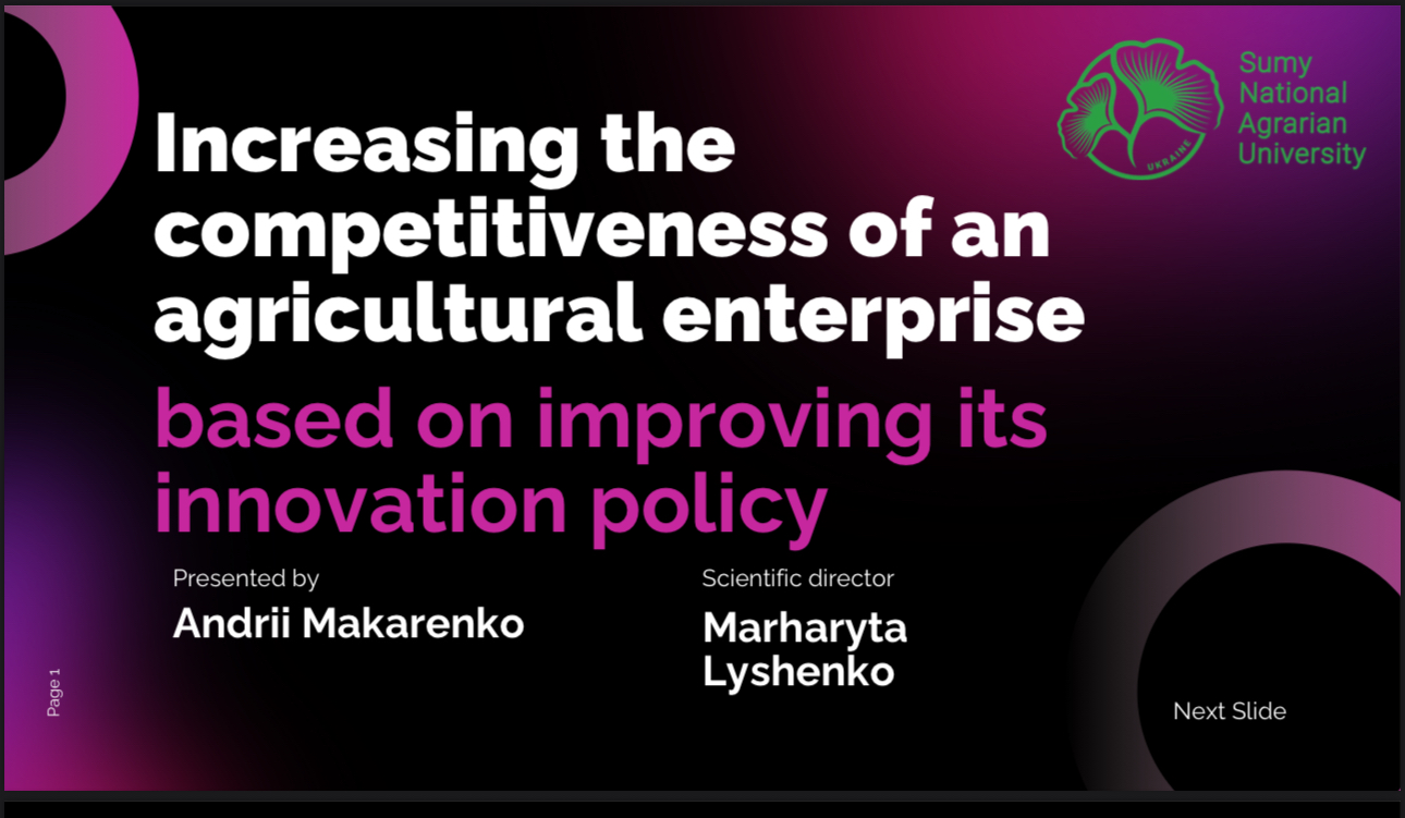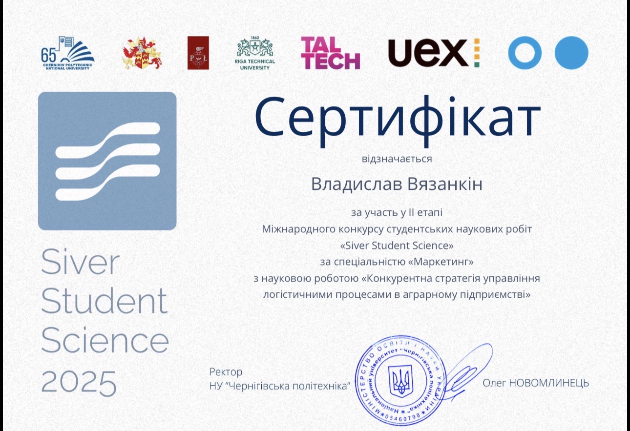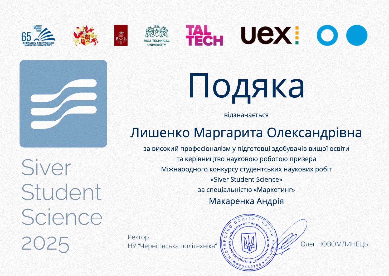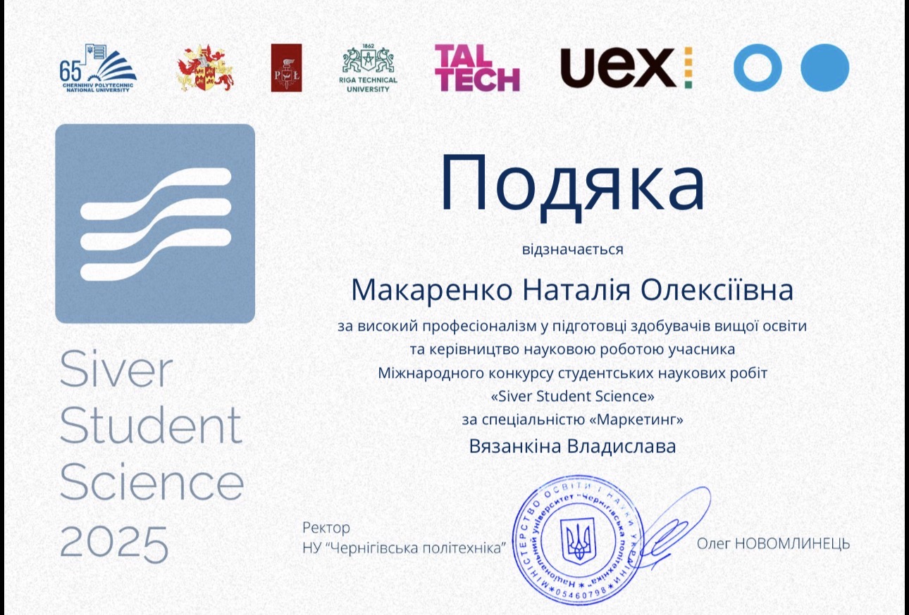 2 грудня 2025 року в Національному університеті «Чернігівська політехніка» відбулась підсумкова конференція Міжнародного конкурсу наукових робіт здобувачів вищоі освіти зі спеціальності «Маркетинг» «Siver Student Science». За результатами проведеного конкурсу третім призовим місцем була відзначена наукова робота студента 4 курсу спеціальності #Маркетинг Макаренка Андрія “Increasing the competitiveness of an agricultural enterprise based on improving its innovation policy” (науковий керівник професор Маргарита Лишенко).