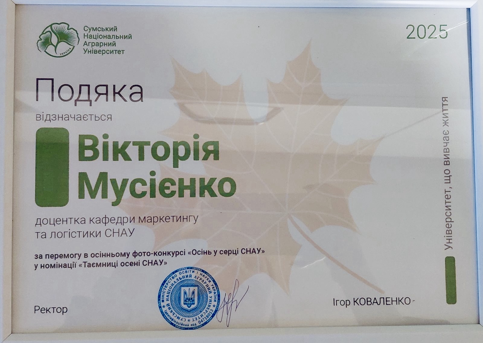 Творчий погляд, відчуття краси та любов до рідного університету допомогли передати неповторну атмосферу осені в стінах університету. За вагомий внесок у розвиток творчого життя університетської спільноти переможницю відзначено Подякою ректора.