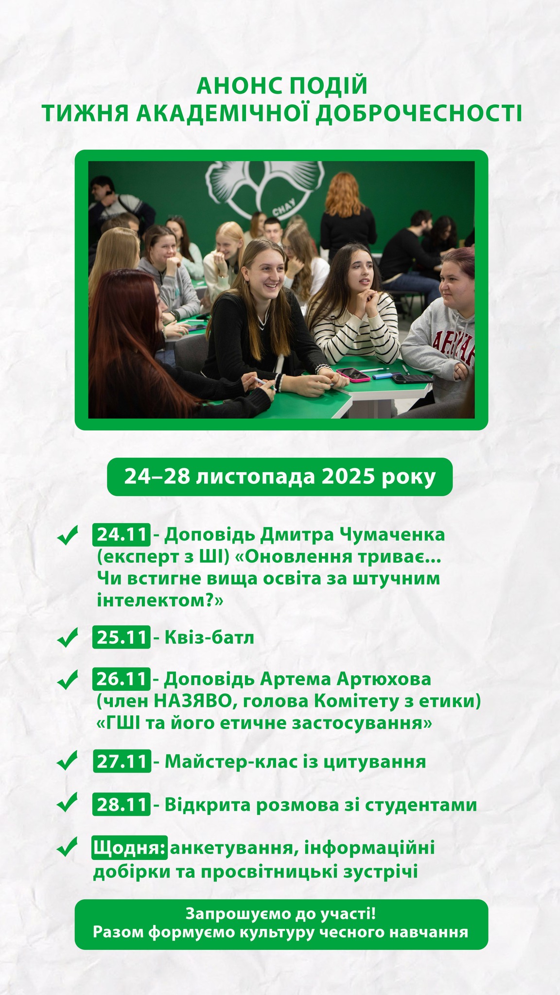 Протягом тижня — лекції, зустрічі, квізи та освітні заходи, спрямовані на розвиток культури чесного навчання й відповідального лідерства.