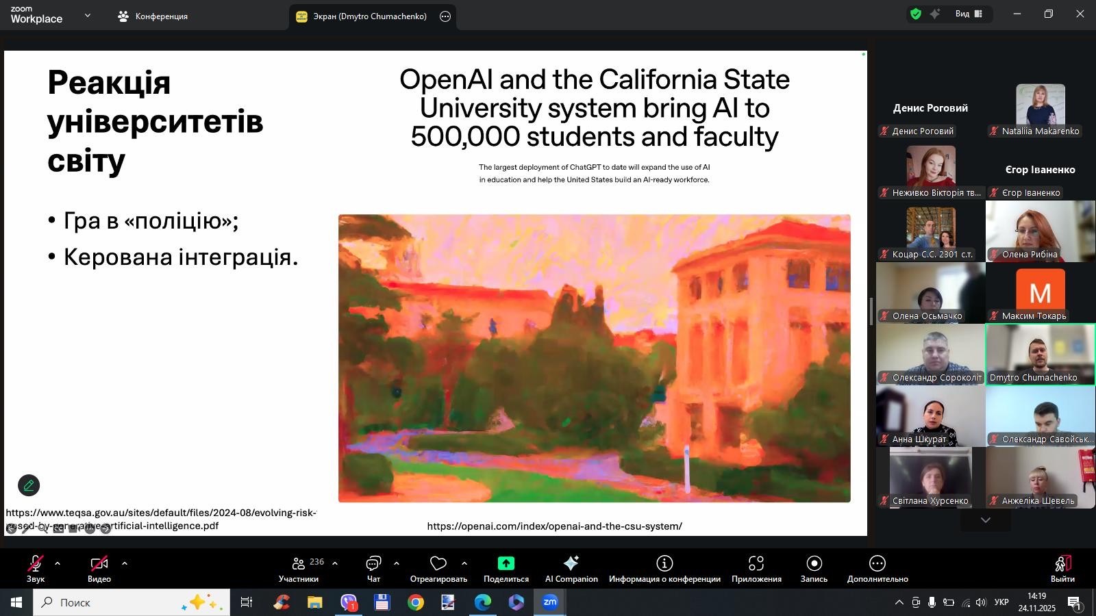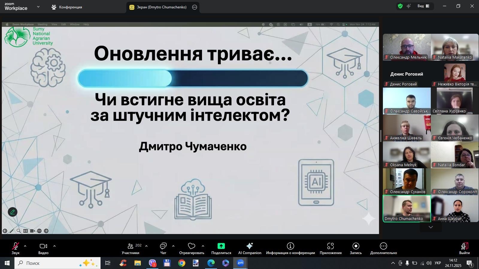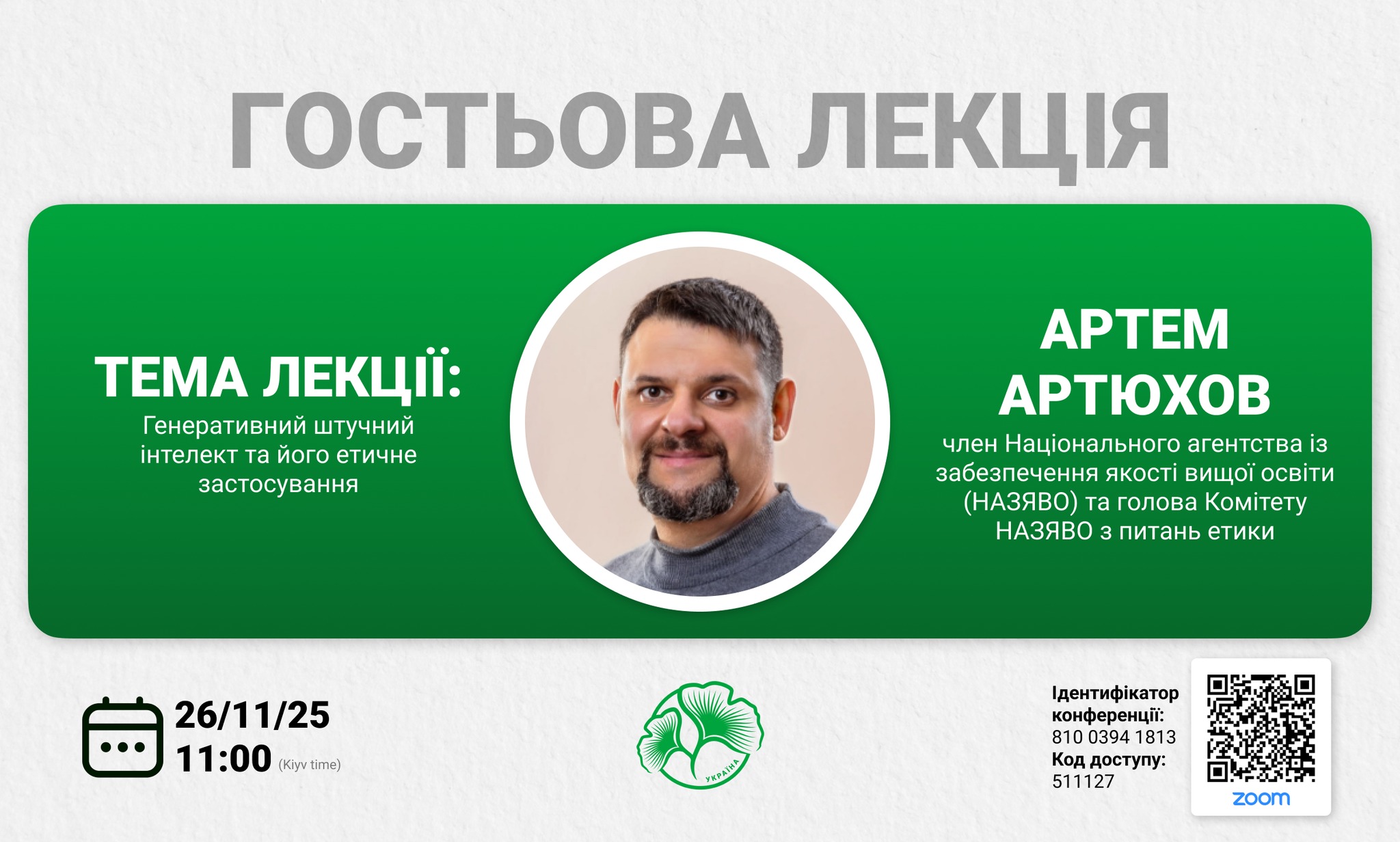 24 листопада відбулась онлайн зустріч з Артемом АРТЮХОВИМ, членом Національного агентства із забезпечення якості вищої освіти (НАЗЯВО) та голови Комітету НАЗЯВО з питань етики. Тема зустрічі «ГШІ та його етичне застосування». Спікером були визначені ключові принципи відповідального використання генеративних штучних інтелектів, ризики та можливості технології, а також практичні кейси її застосування у різних сферах. Такі зустрічі допомагають формувати культуру безпечного та усвідомленого використання ГШІ — дякуємо всім учасникам за активність!