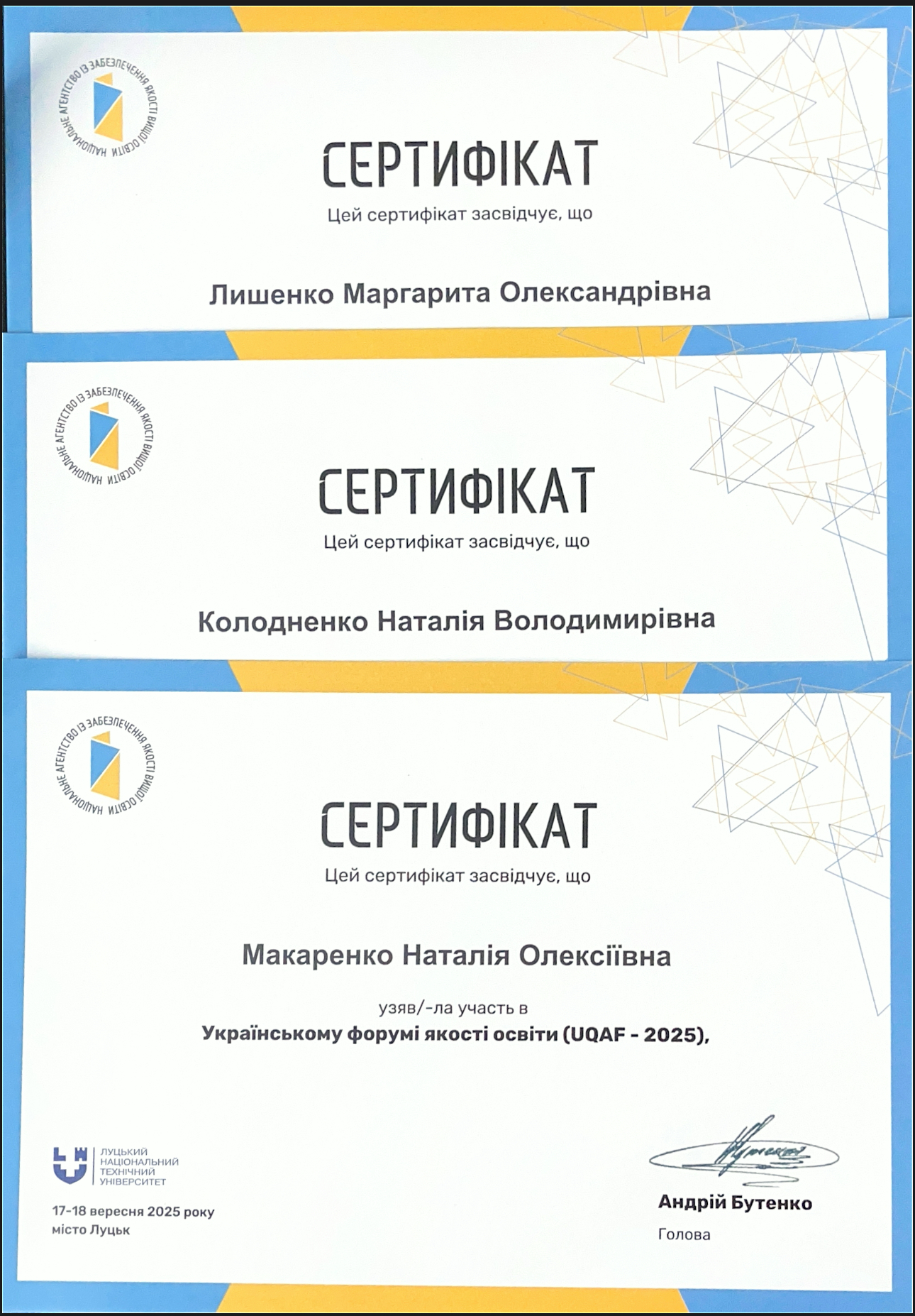 17-18 вересня 2025 року на базі Луцького національного технічного університету відбувся Український форум якості освіти (UQAF-2025, Ukrainian Quality Assurance Forum). UQAF – найбільша в Україні комунікаційна платформа для обговорення актуальних питань розбудови системи забезпечення якості вищої освіти та повʼязаних з цим питань. До складу офіційної делегації СНАУ долучились представники Кафедра маркетингу та логістики СНАУ завідувач кафедри, професор Наталия Макаренко, професор Маргарита Лишенко та доцент Наталія Колодненко. Разом із понад 700 учасниками з різних регіонів України та інших країн вони долучились до обговорення провідних європейських тенденцій у сфері забезпечення якості освіти, питань інституційної акредитації, ролі студентського самоврядування, розвитку технологічної освіти та формування культури академічної доброчесності.