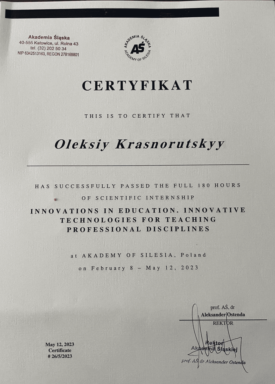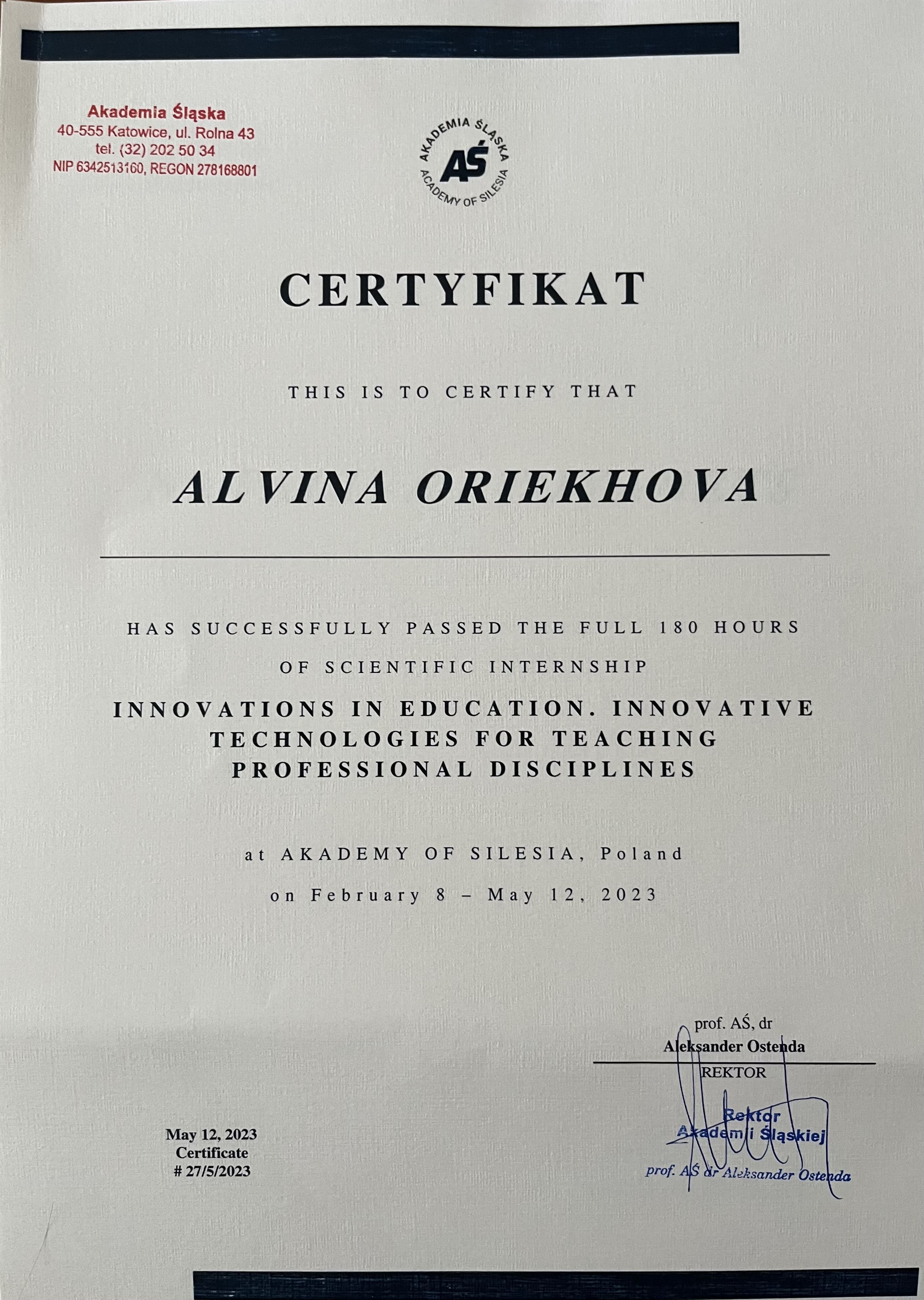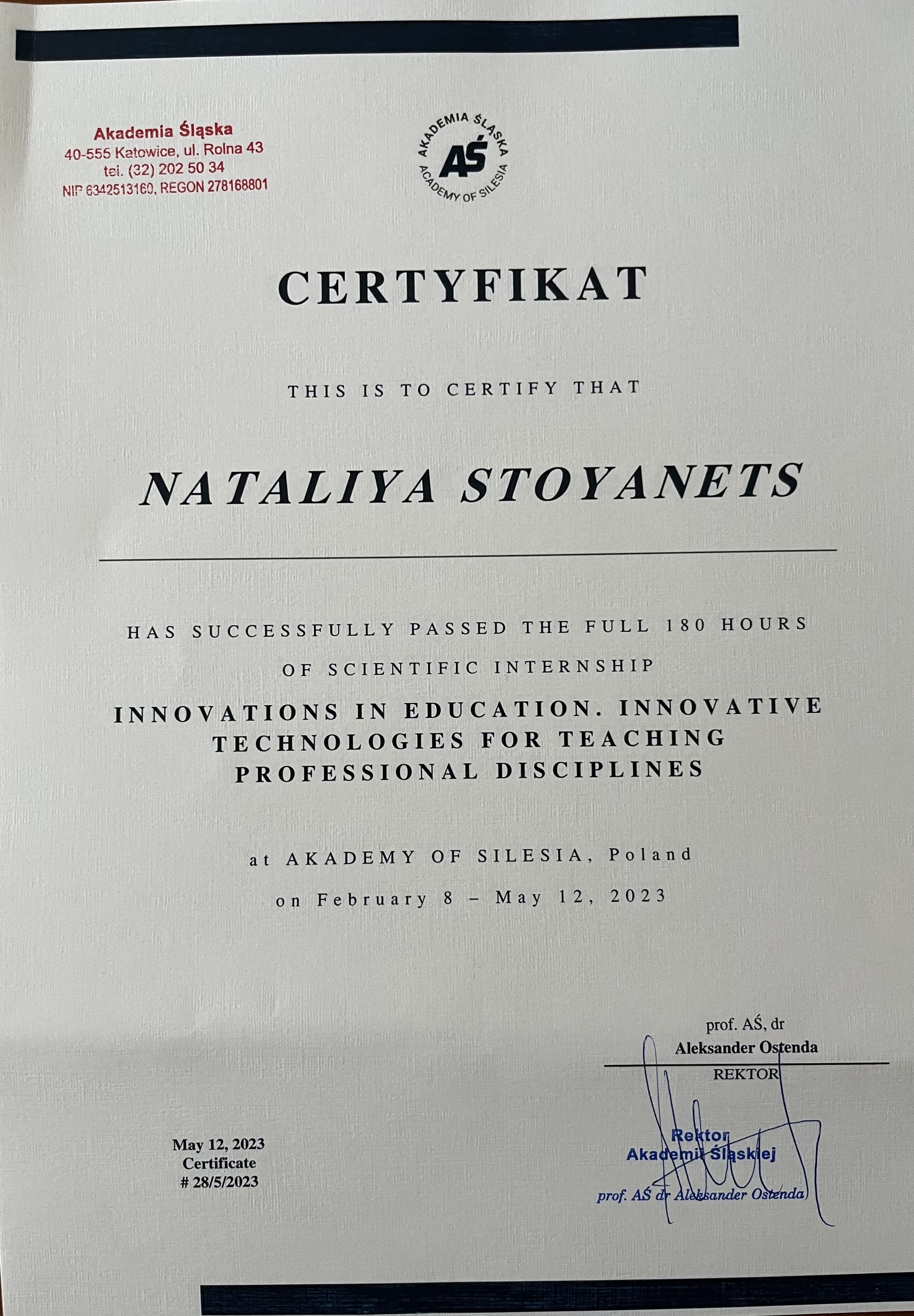 У рамках підвищення професійної кваліфікації викладачі кафедри Олексій Красноруцький, Альвіна Орєхова, Людмила Хромушина, Наталя Стоянець взяли участь у міжнародному науковому стажуванні, яке проходило з 8 лютого по 12 травня 2023 року в Академії Сілезії (Akademia Śląska, Katowice, Poland).