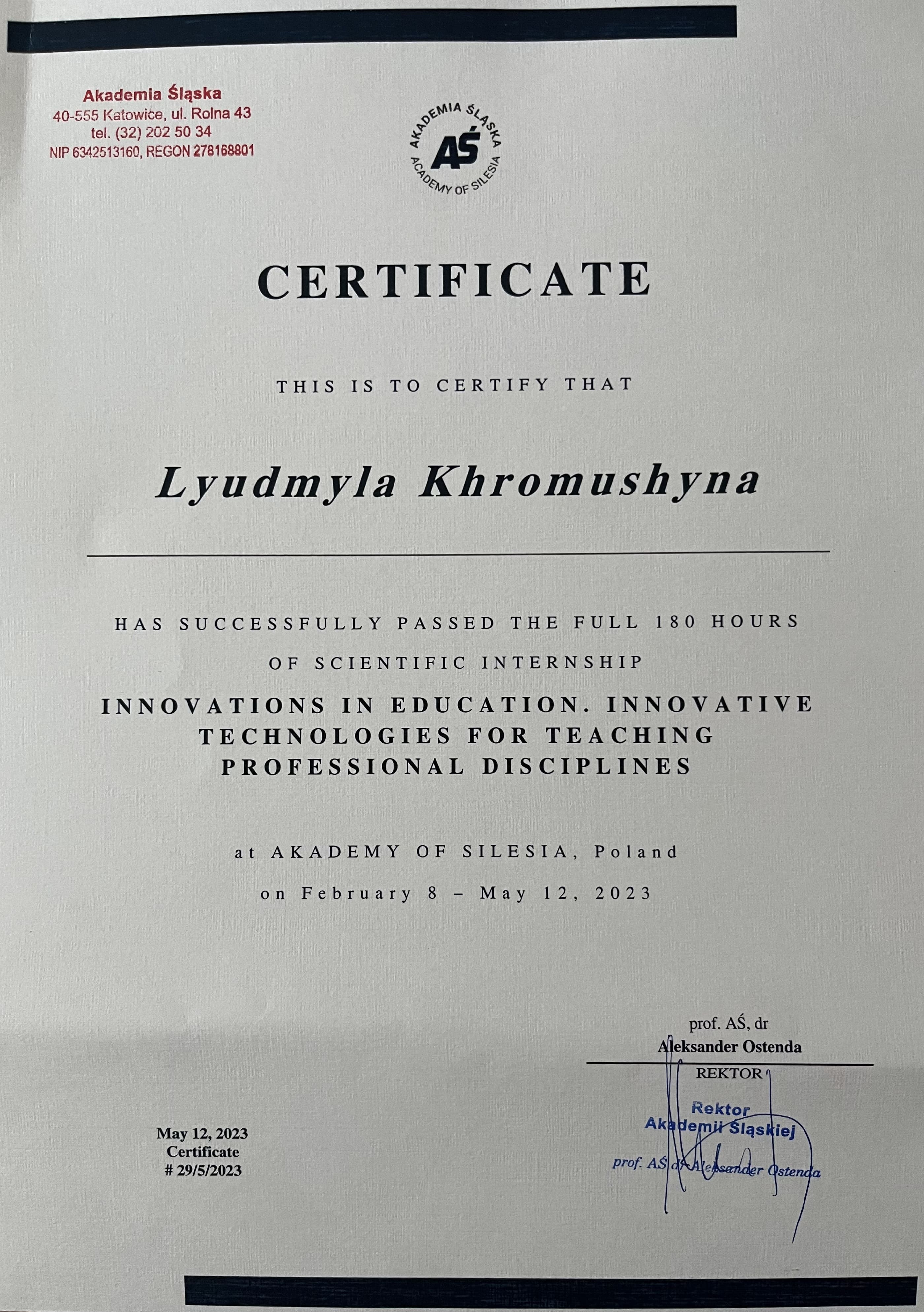 Тема стажування: «Інновації в освіті. Інноваційні технології викладання професійних дисциплін». Загальна тривалість програми склала 180 годин.