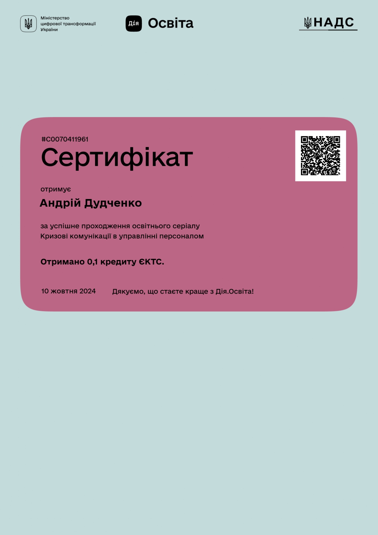 У рамках вивчення освітнього курсу «Лідерство та управління командною взаємодією», здобувачі вищої освіти освітньої програми «Менеджмент організацій і адміністрування» успішно пройшли курси на платформі «Дія.Освіта» та отримали сертифікати.
