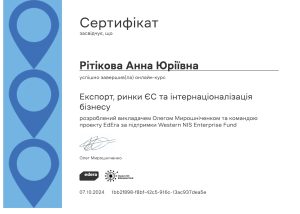 У рамках освітнього компоненту «Міжнародні економічні відносини» здобувачі 4 курсу пройшли навчання на курсі «Експорт, ринки ЄС та інтернаціоналізація бізнесу».