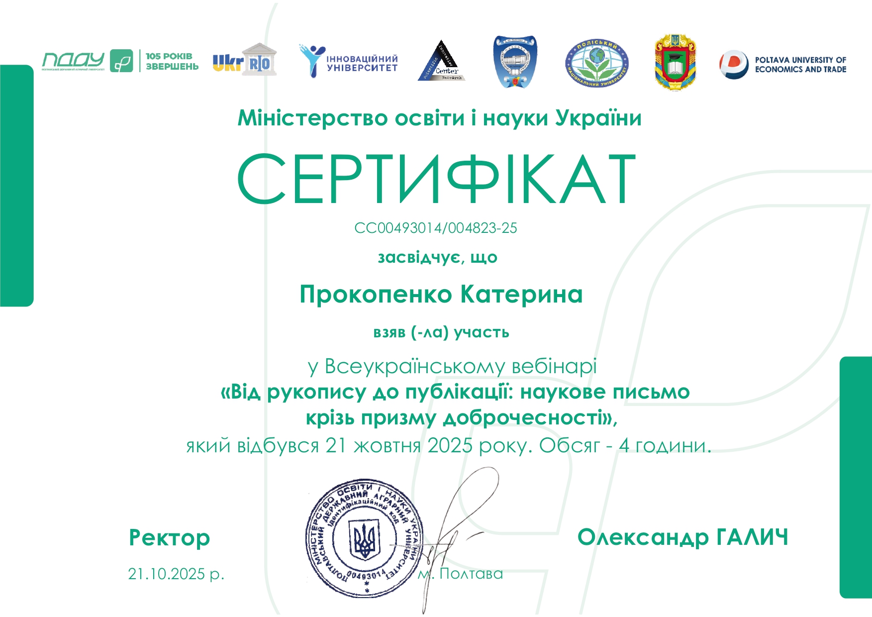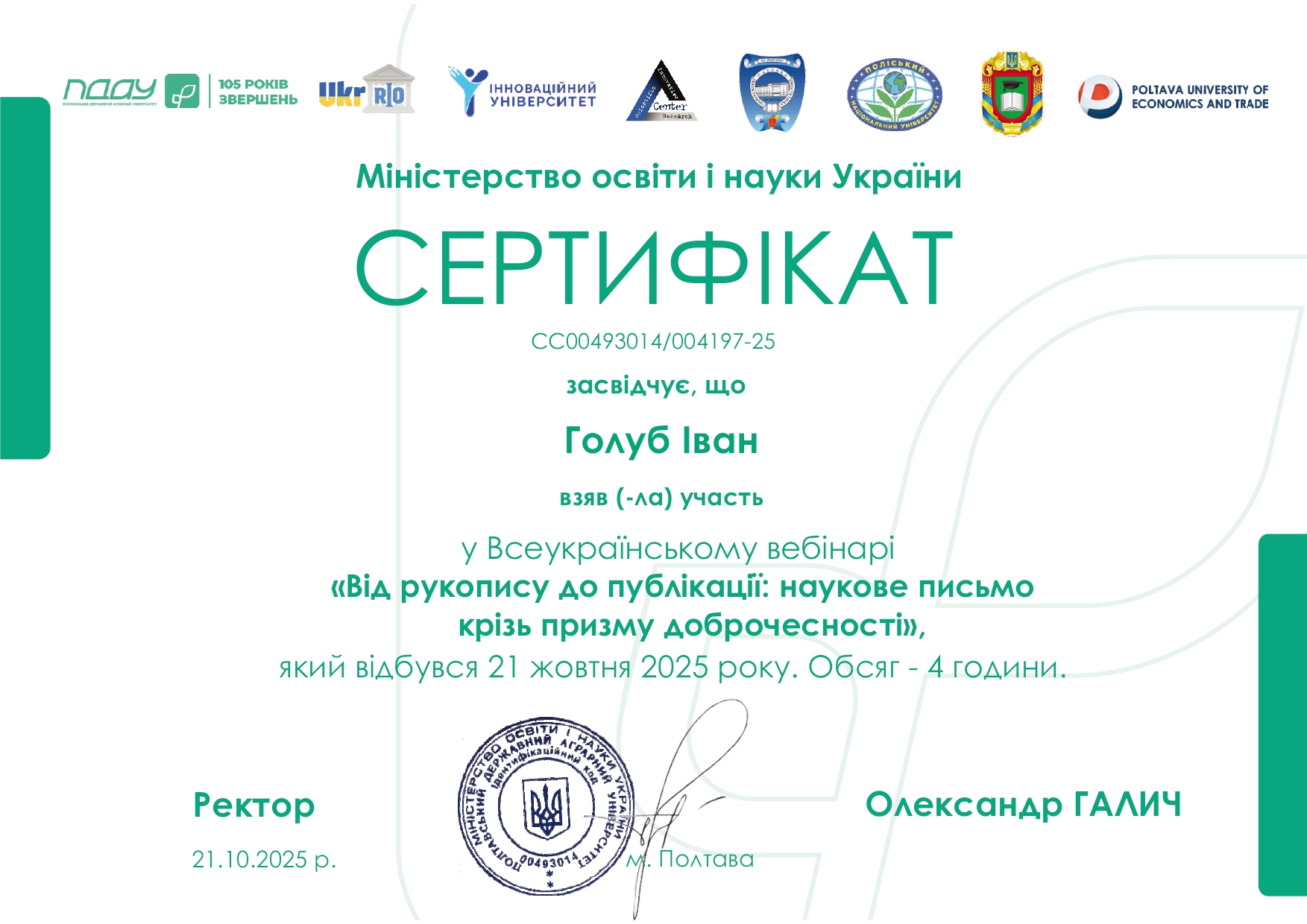 Участь у вебінарі дозволила викладачам та здобувачам освіти кафедри поглибити знання про сучасні вимоги до наукової доброчесності, академічної етики та відповідального використання новітніх технологій у наукових дослідженнях. Отримані знання будуть інтегровані в освітній процес та дослідницьку роботу кафедри.