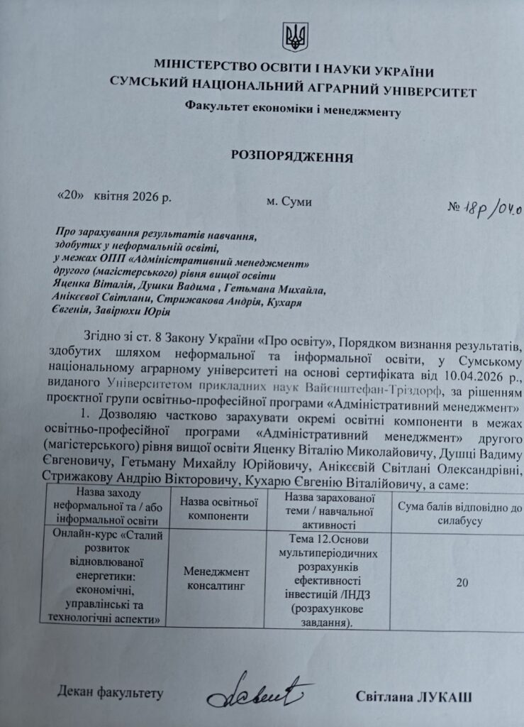 Відповідно до розпорядження щодо визнання результатів навчання, здобутих у процесі неформальної освіти від 20 квітня 2026 року здобувачів освітньої програми «Адміністративний менеджмент» слухачам онлайн-курсу «Сталий розвиток відновлюваної енергетики: економічні, управлінські та технологічні аспекти» зараховано окремі навчальні активності в межах дисципліни «Менеджмент консалтинг». Зокрема, підтверджено виконання теми «Основи мультиперіодичних розрахунків ефективності інвестицій» із відповідним нарахуванням балів згідно силлабусу.