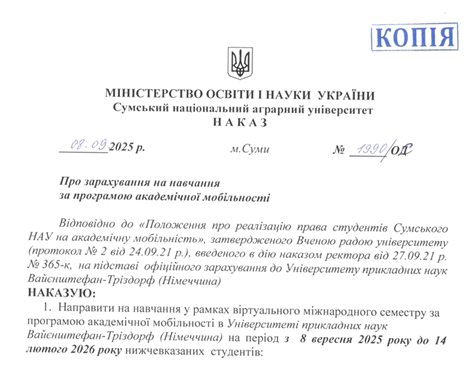 Студенти факультету економіки та менеджменту розпочали участь у програмі академічної мобільності в межах міжнародного співробітництва з Hochschule Weihenstephan-Triesdorf (Німеччина). Навчання відбувається в онлайн-форматі протягом семестру 2025–2026 навчального року та передбачає опанування профільних дисциплін англійською мовою. Участь у програмі реалізується за підтримки ініціативи Erasmus+, що сприяє розширенню міжнародних освітніх можливостей для українських студентів. Програма мобільності дозволяє здобувачам вищої освіти поглибити професійні компетентності, ознайомитися з європейськими підходами до викладання та розширити міжкультурну комунікацію. Факультет і надалі активно підтримує розвиток міжнародної академічної співпраці та інтеграцію студентів у глобальний освітній простір.