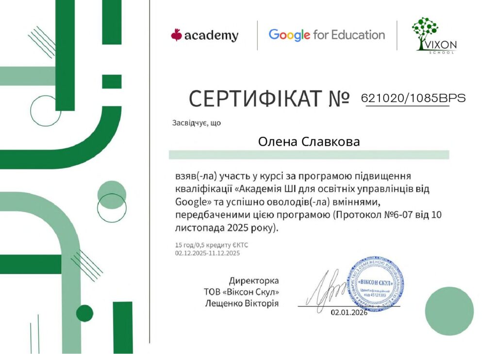 Раді повідомити, що д.е.н., професор кафедри публічного правління та адміністрування Олена Славкова, успішно завершила навчання за програмою підвищення кваліфікації «Академія ШІ для освітніх управлінців від Google».