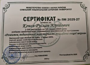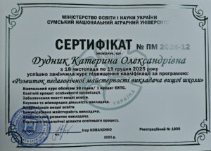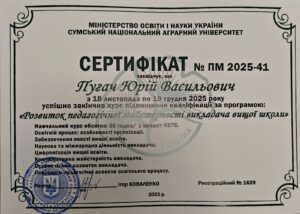 У СНАУ відбувся курс підвищення кваліфікації «Розвиток педагогічної майстерності викладача вищої школи»! Упродовж 18 листопада – 19 грудня 2025 року в Сумському національному аграрному університеті відбувся курс підвищення кваліфікації «Розвиток педагогічної майстерності викладача вищої школи». Захід став важливою складовою системної роботи університету, спрямованої на вдосконалення якості освітнього процесу та розвиток науково-педагогічного потенціалу закладу.
