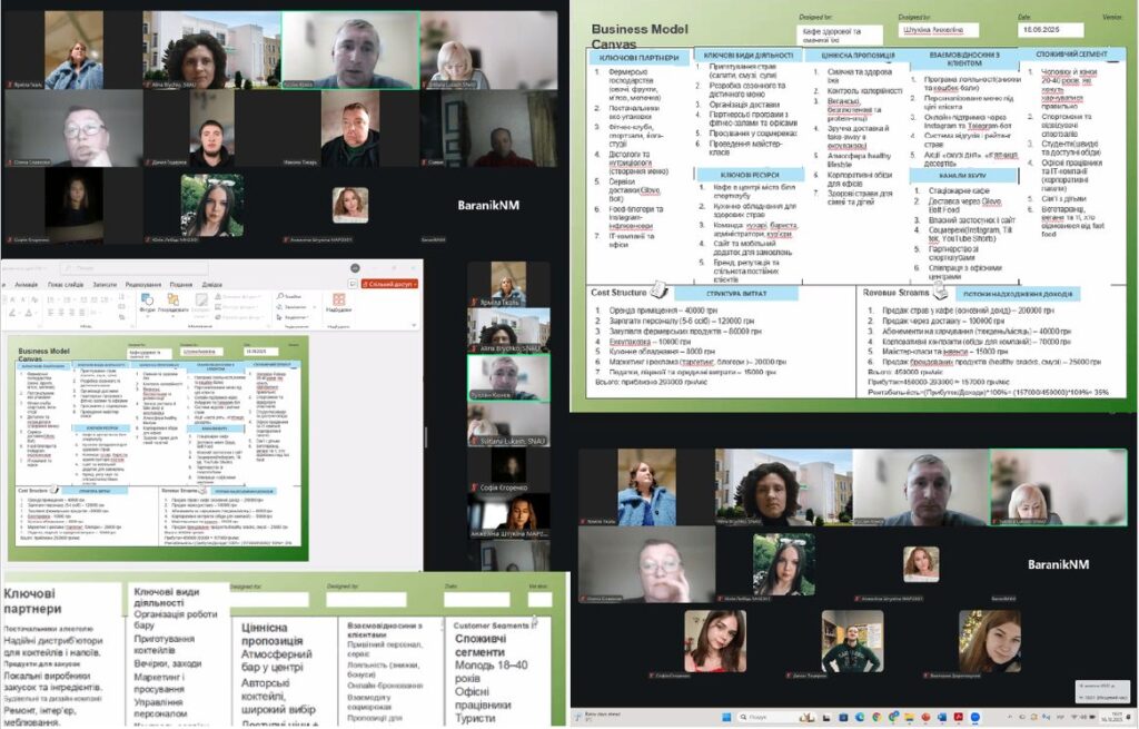 Під час заняття студенти ознайомилися зі структурою фінансового плану, методикою складання прогнозів та оцінкою ефективності підприємницької діяльності. Окрема увага була приділена використанню бізнес-моделі CANVAS як інструменту стратегічного планування, що дозволяє комплексно оцінити ключові елементи бізнесу: ціннісну пропозицію, сегменти клієнтів, канали збуту, партнерів, ресурси та структуру витрат.