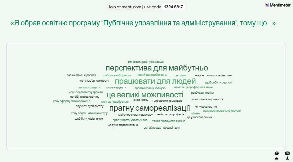 ☘️На кафедрі публічного управління та адміністрування відбулося інтерактивне онлайн-опитування серед здобувачів другого (магістерського) рівня вищої освіти освітньо-професійної програми «Публічне управління та адміністрування» із використанням сучасного цифрового інструменту Mentimeter.