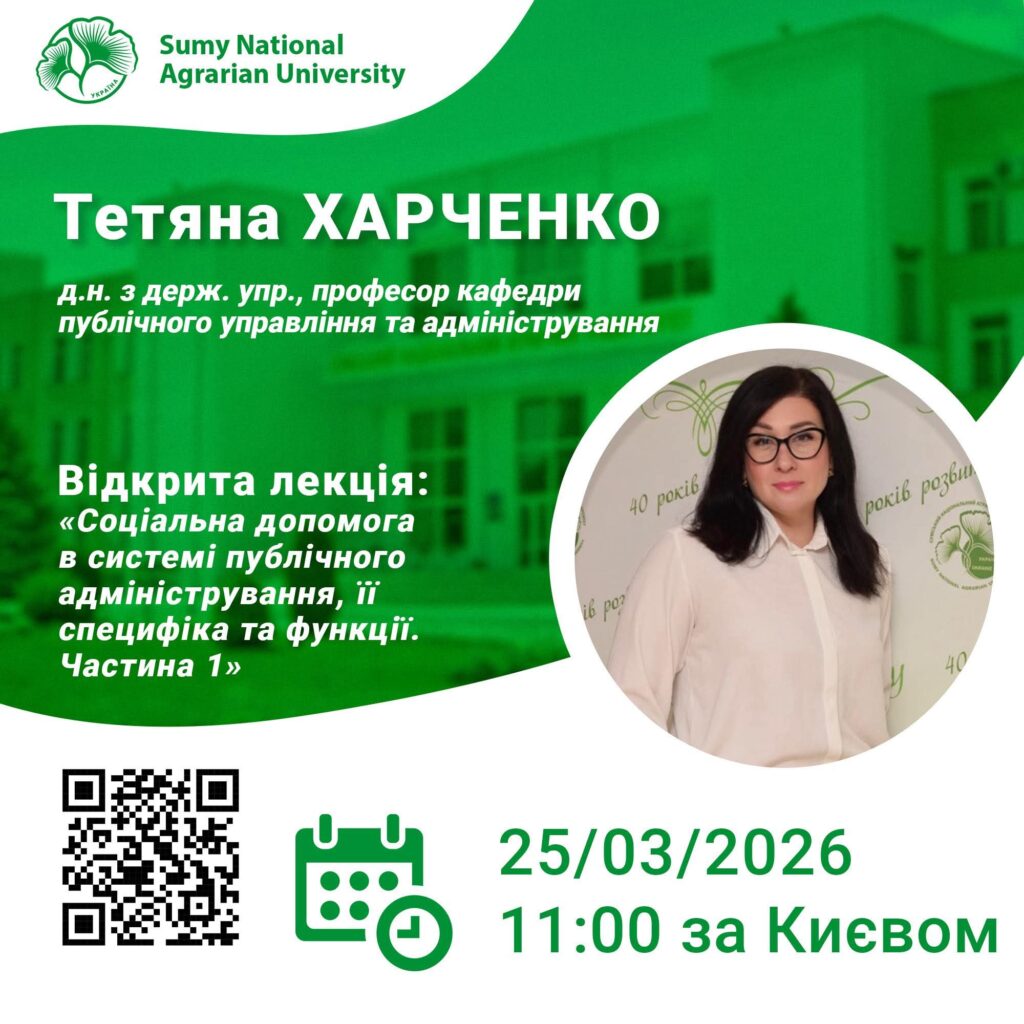 25 березня 2026 року об 11:00 (3 пара) відбудеться відкрите лекційне заняття для студентів денної форми навчання, спеціальності 232 “Соціальне забезпечення” першого (бакалаврського) рівня вищої освіти, курс 3, групи СЗ 2301 з дисципліни “Публічне адміністрування соціально-гуманітарної сфери” д.н. з держ. упр., професора кафедри публічного управління та адміністрування Тетяни Харченко.