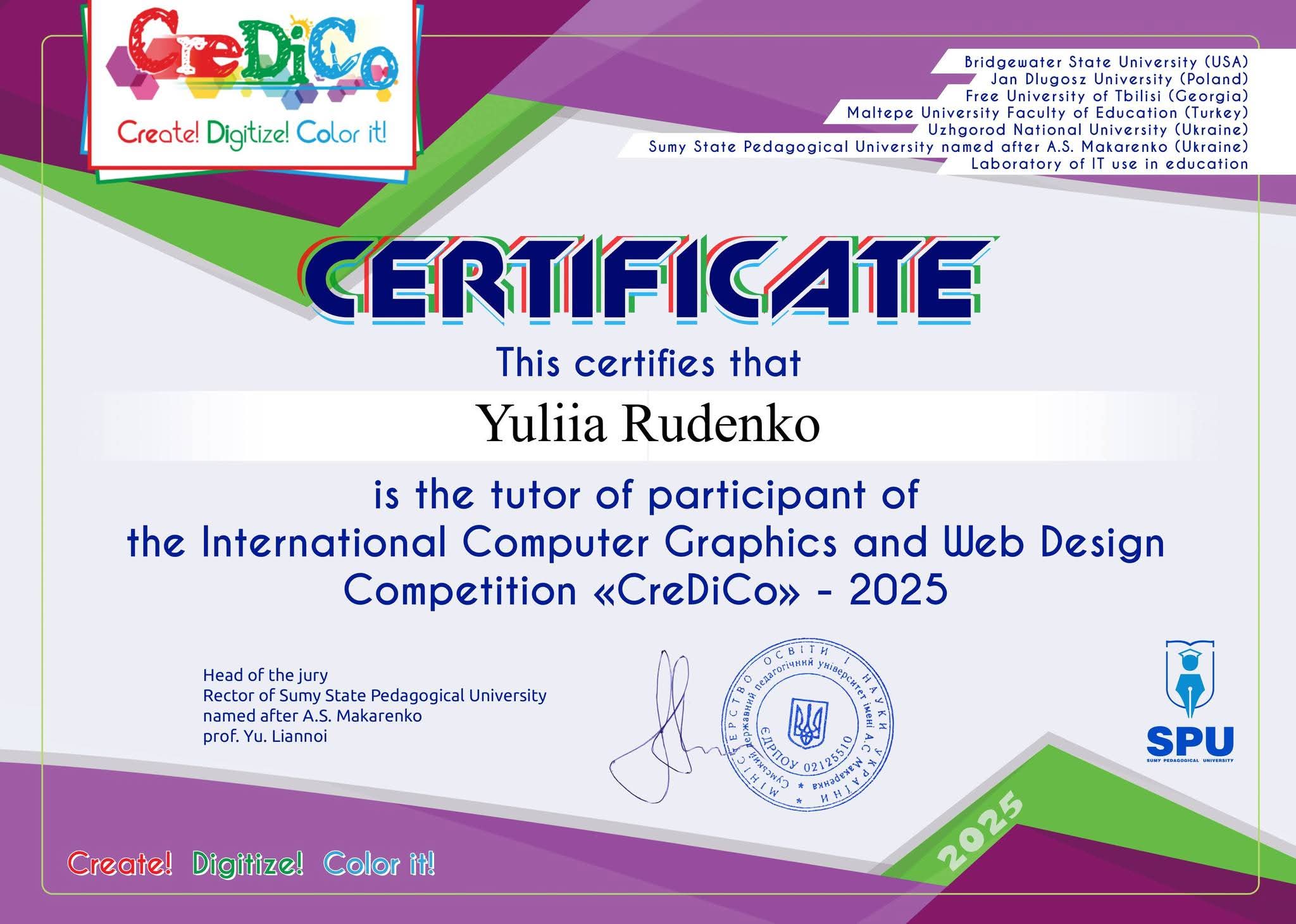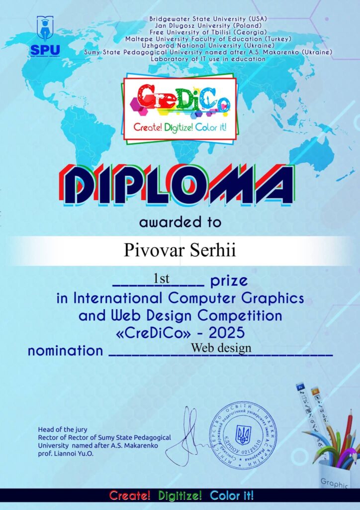 Учергове студенти спеціальності “Інформаційні сиситеми і технології” перемогли у Міжнародному конкурсі з комп’ютерної графіки та вебдизайну «CreDiCo», який проводиться серед молоді, що цікавиться і займається вивченням комп’ютерної графіки, анімації, програмування і вебдизайну.