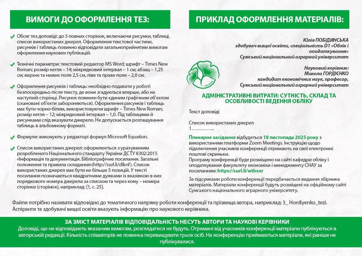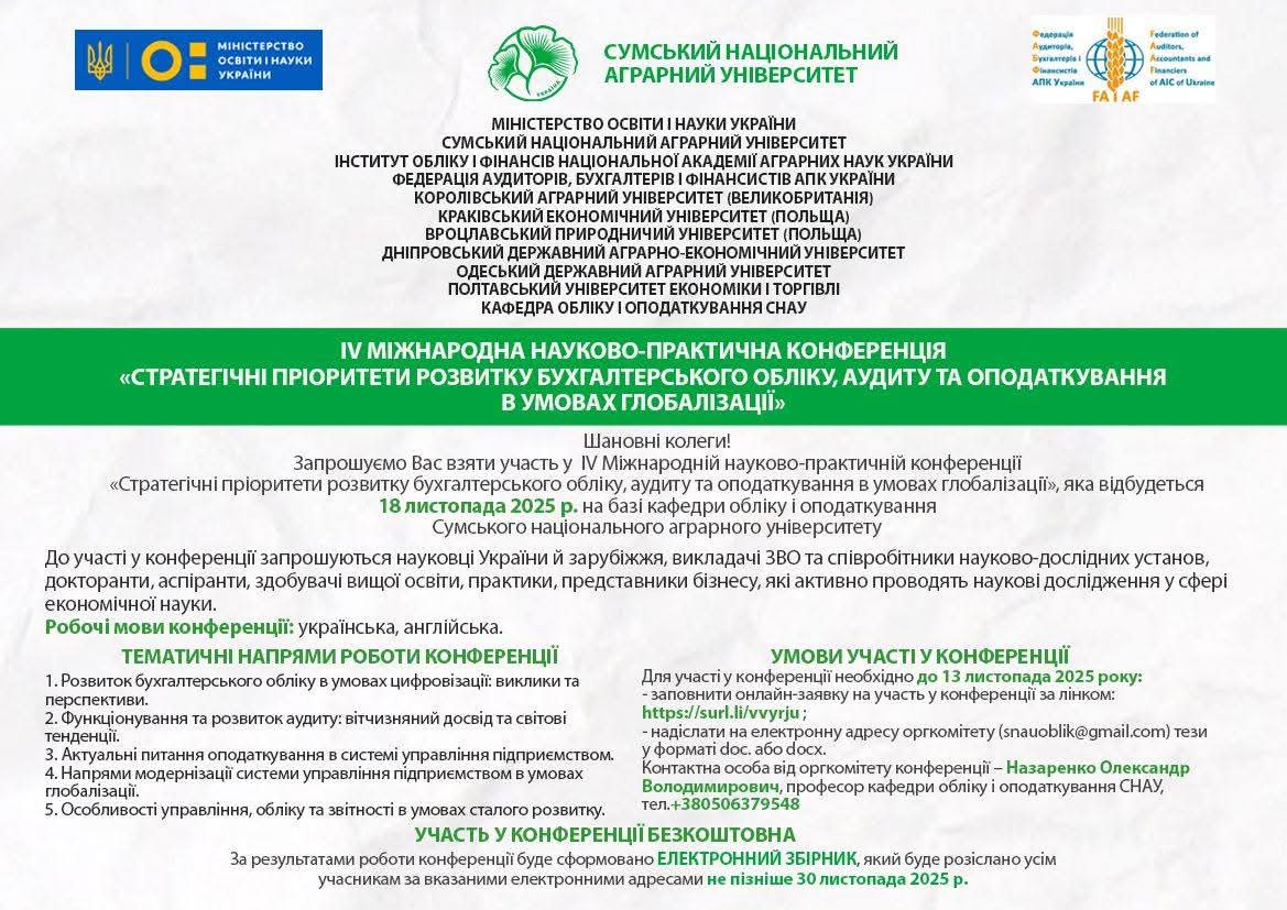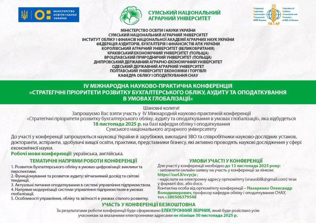 ☘️ ЗАПРОШУЄМО взяти участь у ІV Міжнародній науково-практичній конференції “Стратегічні пріоритети розвитку бухгалтерського обліку, аудиту та оподаткування в умовах глобалізації”, яка відбудеться 18 листопада 2025 року на базі кафедри обліку і оподаткування Сумського національного аграрного університету.